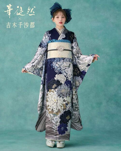 華徒然×吉木千沙都 紺色に白牡丹と白菊が豪華なクラシックモダン着物26040